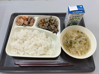 ごはん、牛乳、さけのつけ焼き、五目汁、高野どうふのいり煮。