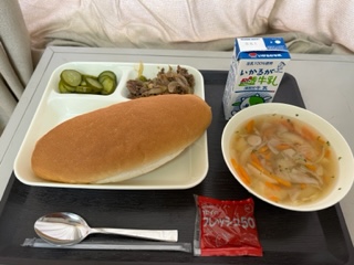 パン、牛乳、牛肉のデミグラスソース煮、スープ、きゅうりのピクルス、いちごジャム。