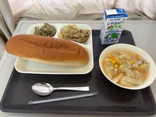 パン、牛乳、豚肉のカレー風味焼き、はくさいのスープ、もやしとピーマンのいためもの。