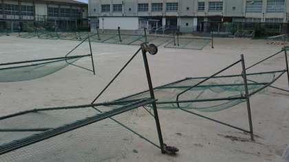 風とともに雨脚が強まり、台風の接近を感じさせます。グランドでは生徒たちがサッカーゴール・ハンドボールゴール・防球ネットを伏せて台風襲来に備えています。