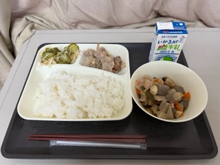 ごはん、牛乳、豚肉のねぎしょうゆ焼き、ふきよせ煮、きゅうりともやしの甘酢あえ。