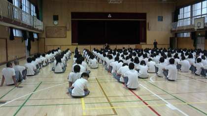 各学年1・2時間目に、体育館・講堂での学年集会で諸注意を受けました。終業式は運動場が使えませんので、放送を利用して行いました。