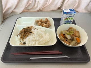 ごはん、牛乳、鶏肉のたつたあげ、あつあげと野菜の煮もの、おかかなっ葉。