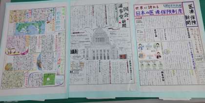 これは、夏休みの宿題の新聞づくりの作品の中から5名、大阪市中学校総合文化祭に出品したものです。3年生の社会科で学習する公民的分野と歴史的分野の現代史の中からテーマを決めて作成しました。どの作品を出品するか、多いに悩まされるほど素晴らしい作品ぞろいでした。