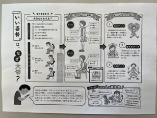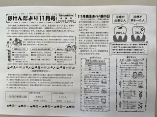 今月のほけんだよりは、11月8日の「いい歯の日」にちなんだ特集と、「いい姿勢」はなぜ大切かを説明しています。