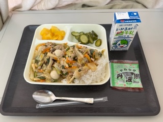 中華丼、牛乳、きゅうりのピリ辛あえ、ソフト黒豆、黄桃(カット缶)。