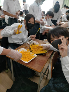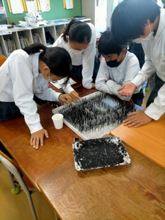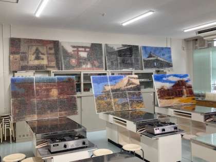 各クラス5000本以上の爪楊枝を8色に染色、乾燥、発泡スチロールに色の指示を書いた後に爪楊枝を刺して、最後に合体して校外学習で行った京都のアートが完成しました。