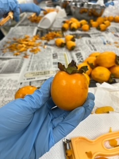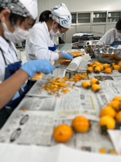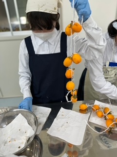 本日家庭科部は、学校で採れた柿で干し柿を作りました。まだまだ渋い状態ですが、1ヶ月天日で干します。甘くなり、食べ頃になるのが楽しみです。皮を剥くのは難しいかったですが、作ってみるのはとても楽しかったです。