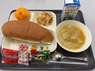 大型コッペパン、牛乳、ツナポテトオムレツ、鶏肉とキャベツのスープ、みかん、豆こんぶ、いちごジャム。