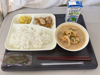 ごはん、牛乳、鶏肉の甘辛焼き、かす汁、くりきんとん、焼きのり。