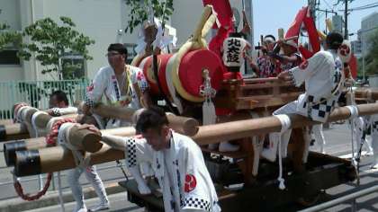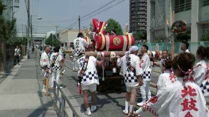 7月31日(金)と8月1日(土)は野里住吉神社の夏祭りです。今日の昼ごろ、夏祭りの「だんじり」が歌島中学校の正門前を曳行していました。引手には私になじみの顔も交じっていました。