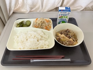 ごはん、牛乳、すき焼き煮、もやしとささみのいためもの、きゅうりのゆず風味。