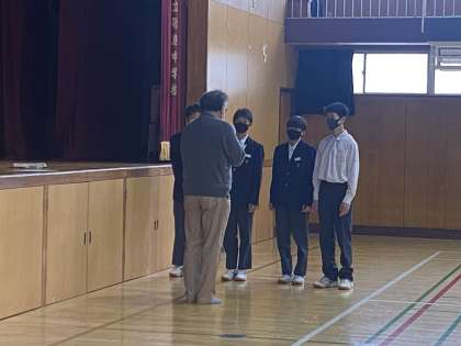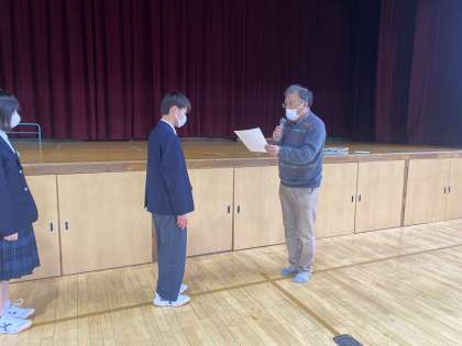 最初に先日の百人一首大会の表彰を行いました。優勝、準優勝、3位のクラスにクラスの賞状を、優秀だった班には個別に賞状を渡しました。