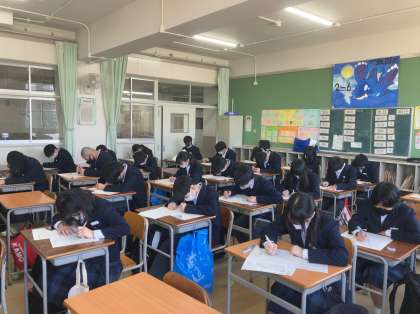 本日、1、2年生は学年末テスト最終日でした。学年最後のテスト、自分の力を発揮できましたか。来週からの返却できちんと見直しをして、次年度に向けてわからないところを無くしていきましょう。