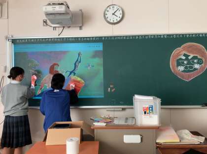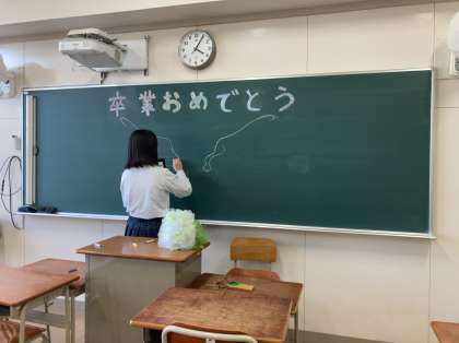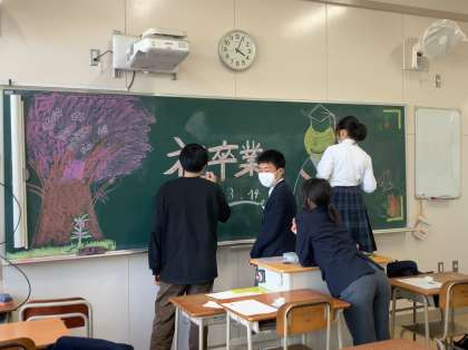 本日午後、各卒業生の教室で在校生有志による黒板アート制作が行われてました。プロジェクターや多色のチョークなどを活用し、卒業生にお祝いの気持ちを描きます。