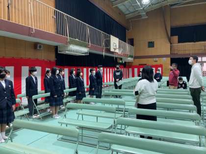 会場準備後、卒業式参列生徒は、式の礼や姿勢の確認などを行いました。