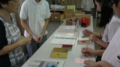 文化委員の生徒が、図書担当の先生方に受付業務を教えてもらいながら頑張っていました。