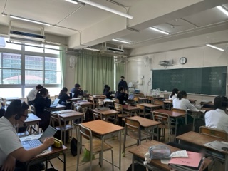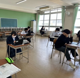 本日、3年生は全国学力状況調査の話し方テストを行いました。1クラスの生徒が3つに分かれて、音声が混じらないようにするために距離を取ってテストを行いました。課題に対して返答した内容を録音するとテスト完了となります。