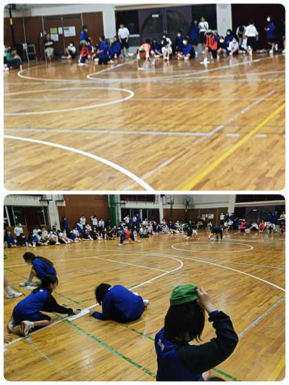競泳です。泳ぐ姿勢で雑巾で床を拭いてリレーでつなぎます。バトンがわりのキャップをうまくかぶるのも勝敗を分けるポイントです。