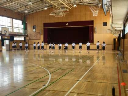 3年生女子体育の授業の様子です。体育館でシャトルランの計測を行なっています。