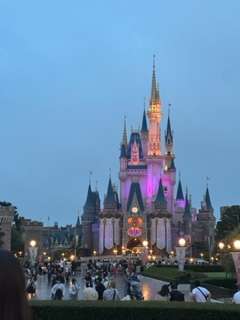 日が暮れてきたので、シンデレラ城がライトアップされています。本日は悪天候のため夜のエレクトリカルパレードは中止となりました。その代わりに別のパレードが行われる予定です。