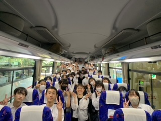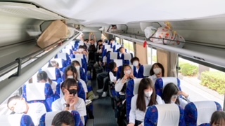 横浜へ向かうバスの車内です。浦安ブライトンホテルから中華街、中華街から新横浜駅の合計で約2時間ほどかかりました。