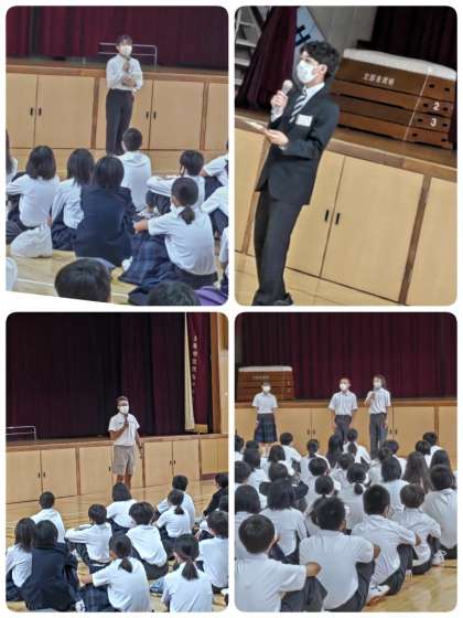 教育実習に来られている、二人の先生から、ご自身の経験もふまえて、学校という場で、いろいろな人から、よいところを学んでいこう、失敗することをおそれずに取り組んでいこう、などという話がありました。