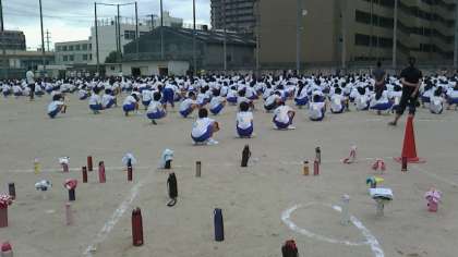生徒席には水筒が林立しています。まだまだ暑い時期の練習でした。