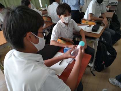 東淀川高等学校の授業です。雲がどのようにして出来るのかをペットボトルを使って実験しました。