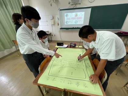 常翔学園高等学校の授業です。グループに分かれて課題解決学習を行いました。グループでしっかり話し合って、その後はそれぞれのグループの発表も行いました。