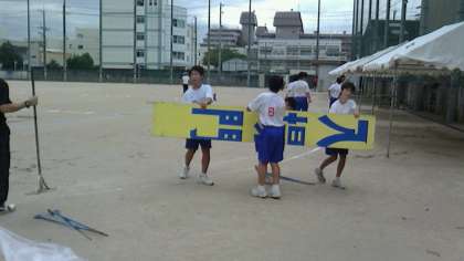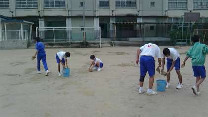 第1グランドでもスポンジで、雨水を吸い取りバケツで運んでくれています。入場門・退場門を運んでる生徒もいます。一輪車で土を運んでる生徒、土をならしている先生方もおられます。