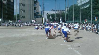 続いて麻袋に体を入れてぴょんぴょん跳ねて
