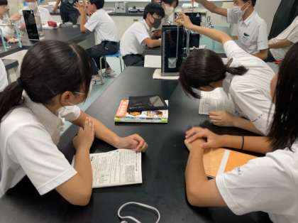3年生理科の授業の様子です。水圧を目で確認するための実験を行っています。