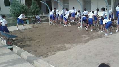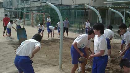 砂がなく空っぽの桶のような砂場に、生徒の力を借りて一気の埋戻し作業です。スコップ・一輪車総動員です。掘り起し何度も攪拌された砂は、湿気が抜けて、空気をたっぷり含み『ふかふか』