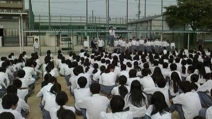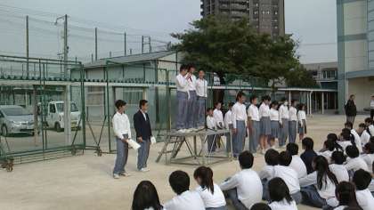 朝礼台の上から、立候補者の立会演説と応援演説がそれぞれありました。先輩方が築いた生徒会を引き継ぎ、より良き歌島中学校にしようという思いを語ってくれていました。