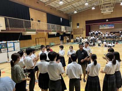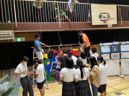 2年生は放課後、班長たちを中心に折り鶴アートを完成させ、体育館に無事、展示を完了させました。