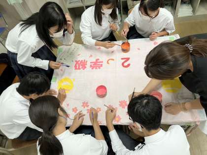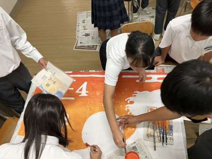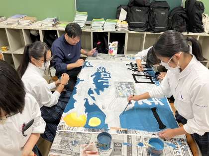 本日、放課後、体育大会で使用する学級旗の作成をおこないました。クラスの士気を高める学級旗には色つけが始まり、色彩豊かな学級旗が完成しつつあります。