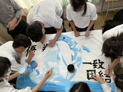 昨日に引き続き、放課後、体育大会で使用する学級旗の作成をおこないました。今日は昨日載せることができなかった3クラスの作成途中の学級旗です。
