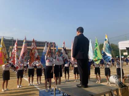 体育委員の宣誓の下、全クラスの学級旗が集います。
