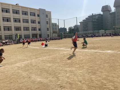 女子400mリレーです。各クラスの女子の代表が競い合います。各クラス気持ちがこもった走りを見せてくれています。