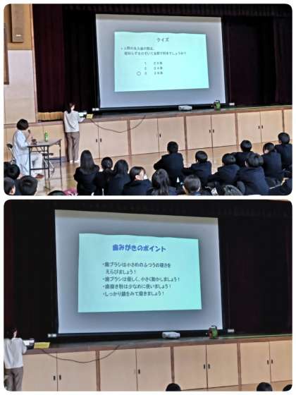 むし歯や歯周病についての原因や予防法について、クイズなども交えて教えていただきました。