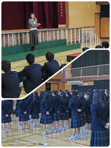 1年生は、12月1日の3.4時間目に合唱コンクールリハーサルを行いました。各クラスが出場順に入退場から、並ぶ位置の確認などを行い、全体合唱も練習しました。広い体育館では、まだまだしっかり声を出す必要がありそうです。本日の、リハーサルで気づいた改善点をしっかり修正して、8日の当日をむかえましょう