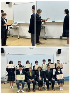 本日の昼休みに税の作文の表彰が行われました。歌島中学校の3年生の9名の生徒が選ばれました。西淀川税務署の方に来ていただき、表彰を行いました。1人ひとり表彰してもらった後、最後は全員で記念撮影を行いました。来週の全校集会でも表彰してもらう予定です。