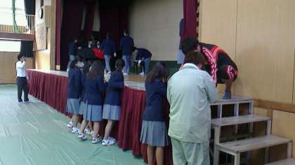 張出舞台の周りに幕を取り付けて舞台完成です。