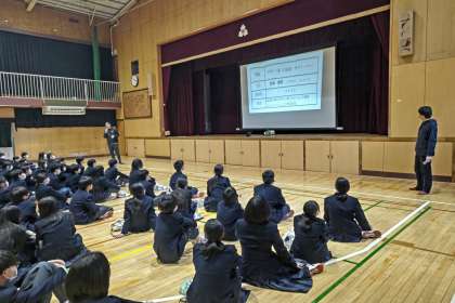 本日は体育館で、丸橋先生、久内先生から、職業について、働く意義、希望の職業につくための進路選定の方法などについて話がありました。