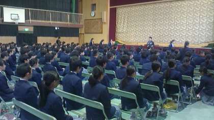 「課題曲」と「自由曲」について音楽科の泊先生から、3年生のクラスごとの講評がありました。各クラスに対してお褒めの言葉がたくさんありました。