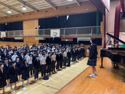 来週火曜日に2回目の全体練習を行います。歌詞を覚えて、さらに視線を上げて、声を上向きに出せるようにしましょう。
