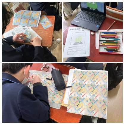 2年生の美術では現在、ギフトラッピングの作成を行っています。誰に送るかを考えてラッピング用紙のデザインから作成して、実際に包装する授業です。一人一人が送る相手のことを想って、丁寧にデザイン作成から包装まで頑張っていました。