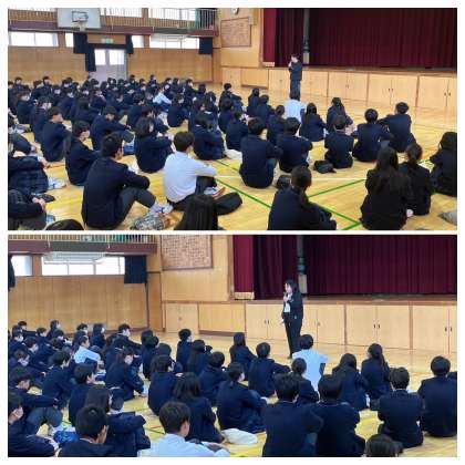 4月12日(金)、3年生学年集会を行いました。山口先生からは、新しい環境になれるようにそれぞれが協力して頑張っていくことの大切さについての話がありました。藤川先生からは、これから定期的に配布する進路指導通信のことや昼休みに進路指導室を開放し、多くの高校のパンフレットなどを自由に閲覧できる場所として活用してほしいという話がありました。