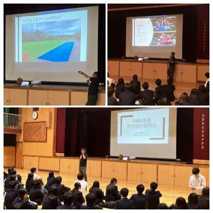 4月15日(月)の1時間目、3年生は体育館で修学旅行の説明を受けました。内容は、修学旅行に行く目的について、行き先や、体験プログラムについてなどの説明を受けました。今回は全体で体験するプログラムと活動班によって体験内容が変わる、選択制プログロムがあり、説明の後で選択制プログラムの希望調査を行いました。